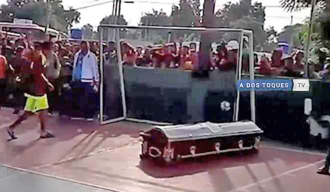 Uno de los jugadores pateó el balón para que golpeara el ataúd y después se metiera en la portería, cuando el difunto “realizó el gol” todos sus familiares y amigos aplaudieron y gritaron. Después lo llevaron al panteón para llevar acabo su sepultura.