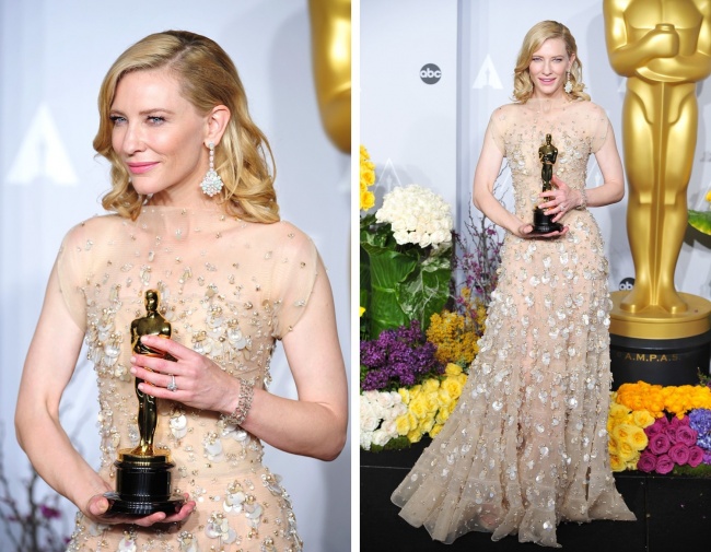 Cate Blanchett lució este vestido semitrasparente de Armani para recibir el premio por su actuación en el filme “Jazmín Azul”. Decorado con flores y lentejuelas lució bellísima.