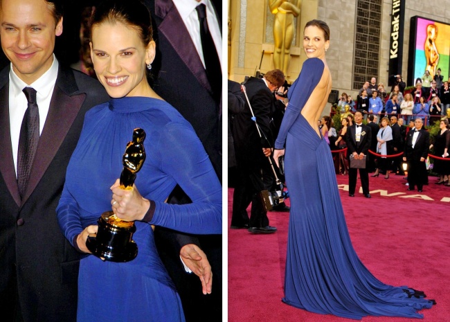 Hilary Swank ese año ganó el Óscar por su actuación en la película “Golpes del destino” dirigida por Clint Eastwood. Su imagen esa noche fue de las más habladas por los asistentes pues sencillamente impactó a todos. Fue un diseño de Guy Laroche con un escote pronunciado en la espalda, simplemente elegante y sexi.