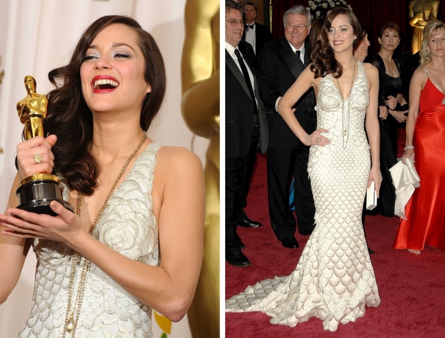 Jean-Paul Gaultier fue el encargado de diseñar este vestido tipo sirena que le otorgó buena suerte a Marion pues fue ese año ganadora a la codiciada estatuilla por su trabajo en el filme de “La vida en rosa” donde protagonizo a la legendaria cantante Edith Piaf.
