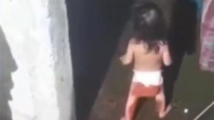 La pequeña vestía solamente un pañal, tenía su cuerpo lleno de pintura y estaba consumiendo los alimentos para animales que se encontraban esparcidos por el suelo.