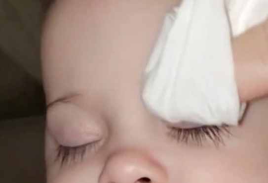 Se la puede ver limpiando el ojo de su hija con un algodón mientras duerme, sin mostrar maquillaje o haber aplicado pestañas postizas.