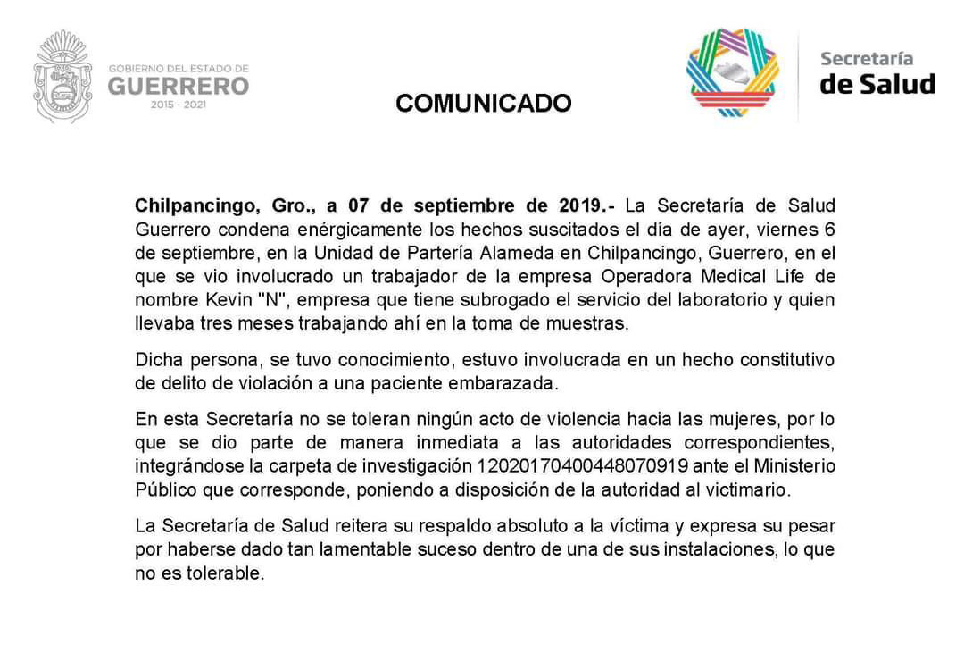 La Secretaría de Salud de Guerrero indicó que Kevin “N” estuvo involucrado en un hecho constitutivo de delito de violación a una paciente embarazada. Por medio de un comunicado, la dependencia resaltó que “no se tolerará ningún acto de violencia hacia las mujeres, por lo que se dio parte de forma inmediata a las autoridades correspondientes, integrándose la carpeta de investigación ante el Ministerio Público.