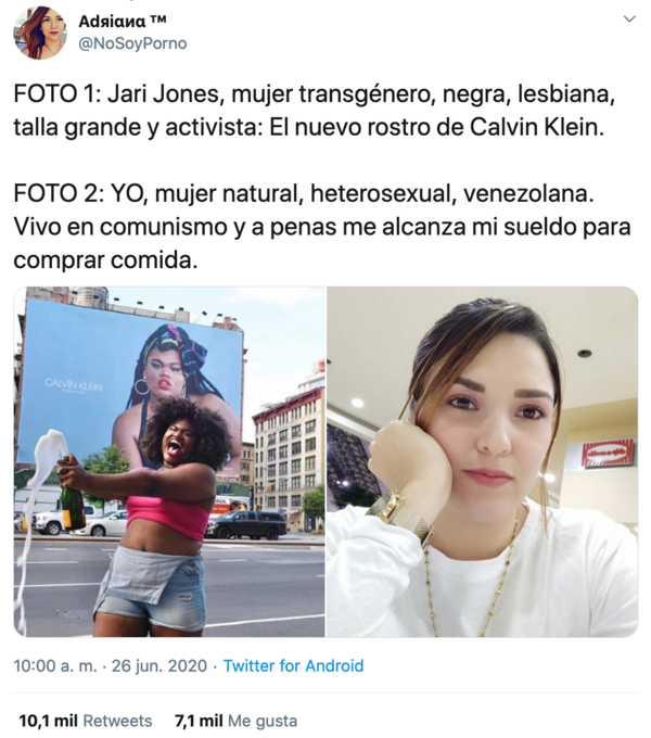 “FOTO 1: Jari Jones, mujer transgénero, negra, lesbiana, talla grande y activista: El nuevo rostro de Calvin Klein. FOTO 2: YO, mujer natural, heterosexual, venezolana. Vivo en comunismo y a penas me alcanza mi sueldo para comprar comida”, publicó @NoSoyPorno junto a una foto de Jari y uno de ella.