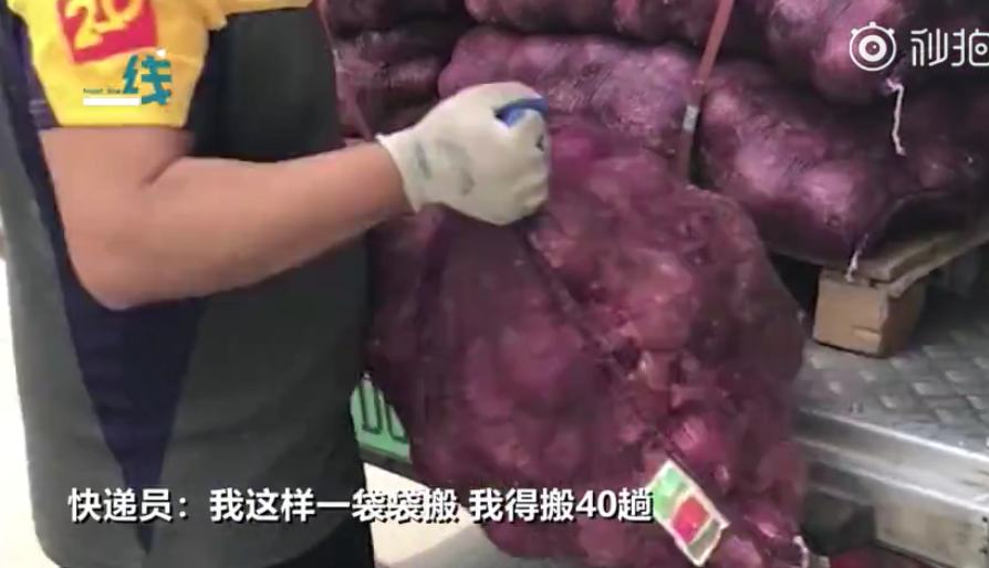 Según medios de comunicación chinos, el repartidor tuvo que descargar, sin ayuda de nadie, docenas de bolsas de cebollas y llevarlas a la dirección designada, una tarea que, según los informes, le hizo decir: “Si no llora, ciertamente lo haré yo”. ”.