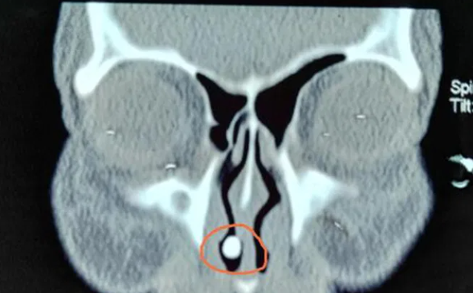 El médico especialista Zhou Jianpo dijo: “Los escáneres mostraron una sombra de alta densidad en la cavidad nasal derecha.