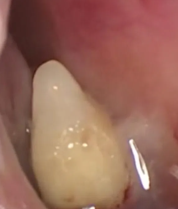 Después de la cirugía, quitaron capas de membrana para descubrir lo que resultó ser un diente completamente desarrollado, con raíz y corona.