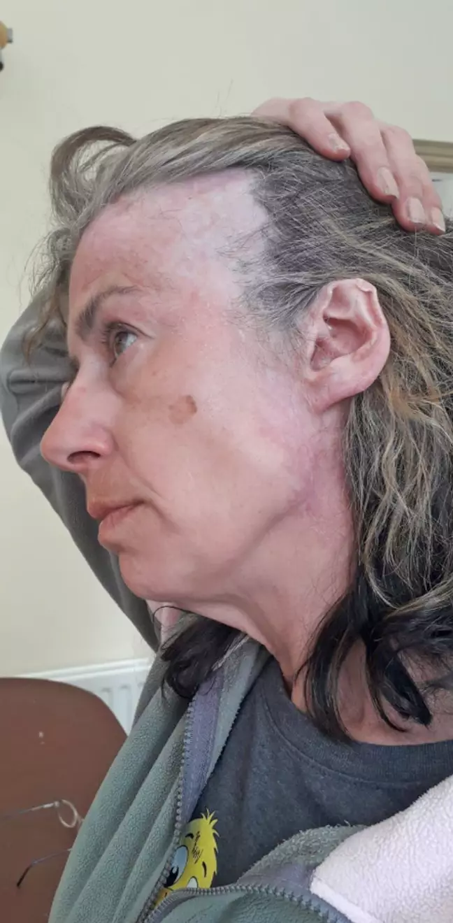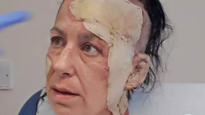 La madre de dos niños fue trasladada al Hospital East Grinstead, donde recibió un injerto de piel de un donante.