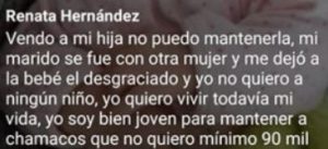 En pleno 10 de mayo los usuarios de redes sociales muestran su enojo al leer publicaciones de este tipo, ya que en palabras textuales de la madre se puede leer: “Vendo a mi hija no puedo mantenerla, mi marido se fue con otra mujer y me dejó a la bebé el desgraciado, y yo no quiero a ningún niño. Yo quiero vivir todavía mi vida, soy bien joven para mantener a chamacos que no quiero, mínimo 90 mil”.