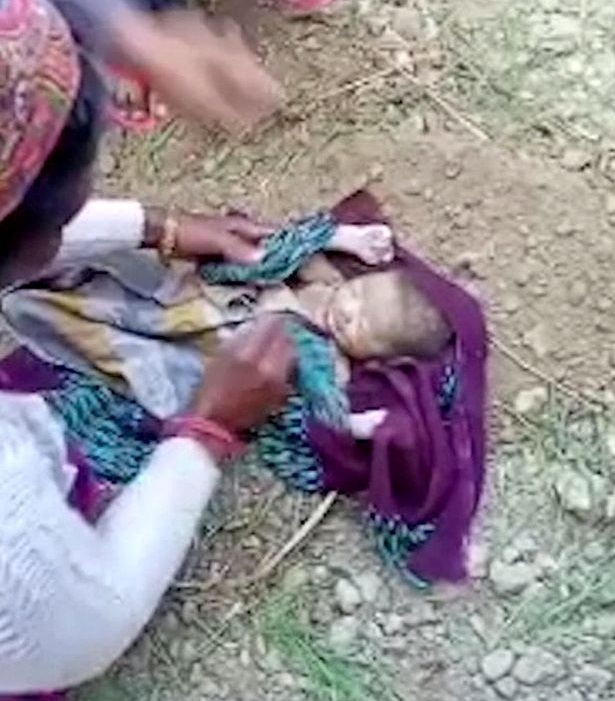 El brazo derecho y la rodilla derecha de la pequeña niña estaban aún visibles y permitido que los residentes la encontraron enterrada en un campo en India, después de ser dejada allí para morir.