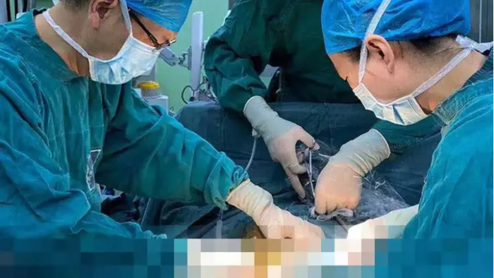 El doctor Li Wusheng y su equipo tuvieron que operar al paciente cuando no pudieron quitar el vaso de cerveza.