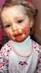 Este inocente acto causó que sufriera ampollas dolorosas y que su piel sensible se cubriera de llagas y pus.