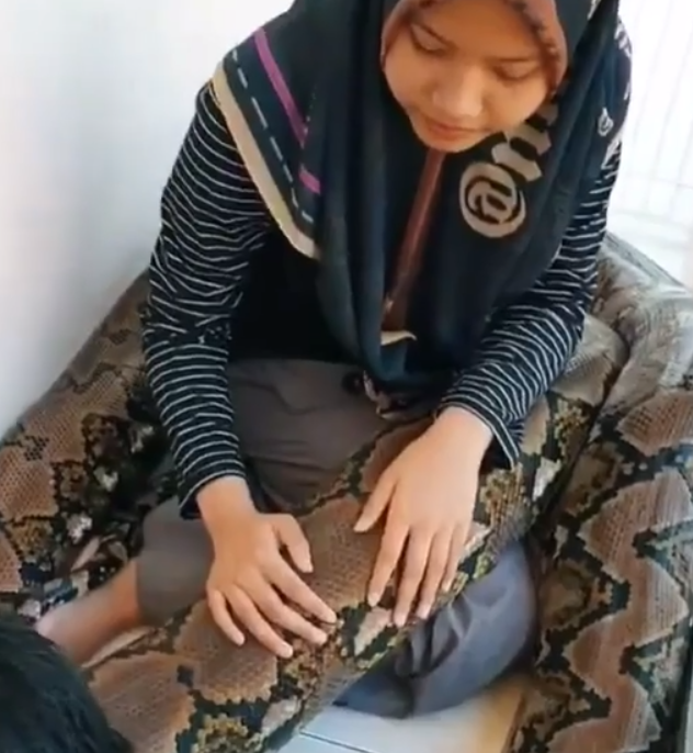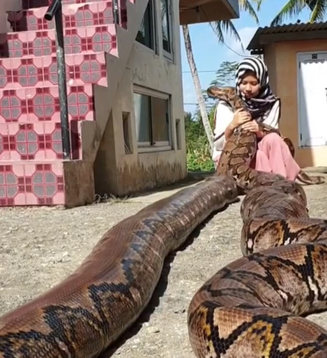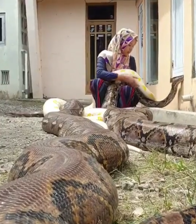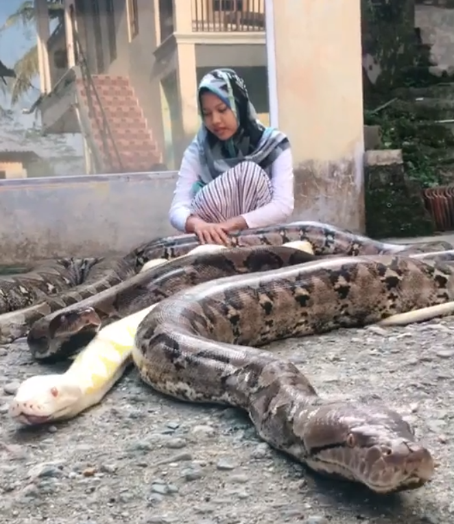 La adolescente de 14 años, que supuestamente es oriunda de Purworejo, Java Central, comparte su casa con seis pitones gigantes y parece no preocuparse por su seguridad cuando está cerca de ellas.