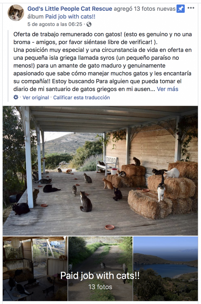Muchos usuarios de Facebook se han mostrado interesados en este formidable trabajo. Aunque cabe mencionar que se debe tener verdadera vocación y amor por los felinos, pues es realmente un gran compromiso cuidar y darle atención a cualquier ser vivo. La experiencia debe ser algo formidable, pues tan sólo vivir en una isla griega debe ser fascinante.