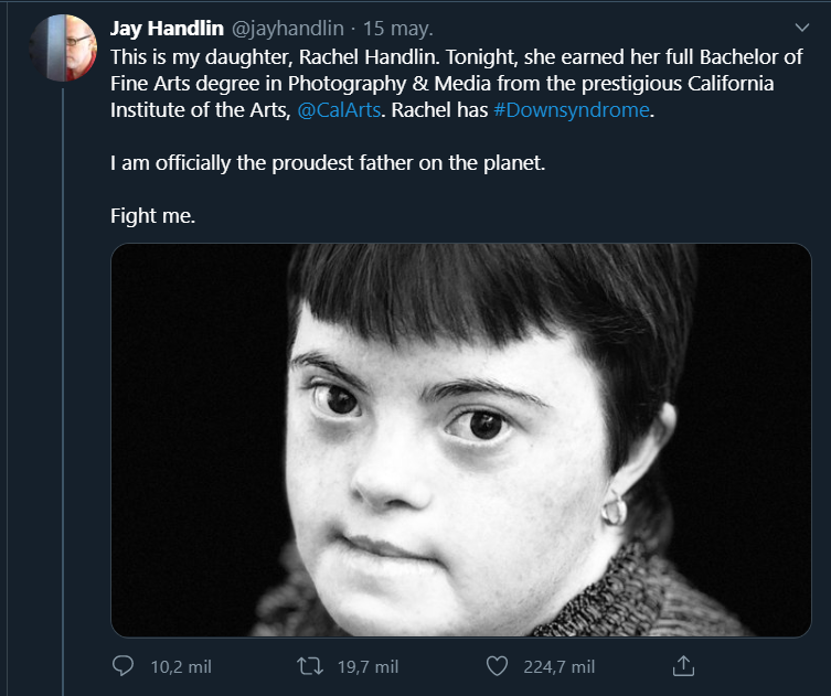 Sin embargo, hoy, padres como Jay Handlin también pueden sacar su pecho con orgullo. De hecho, Handlin afirma que él es “oficialmente el padre más orgulloso del planeta” después de compartir una publicación en Twitter sobre su hija Rachel, que vive con Síndrome de Down y es una recién graduada de la universidad que acaba de obtener su BFA en Fotografía y Medios de CalArts (California, EE.UU).