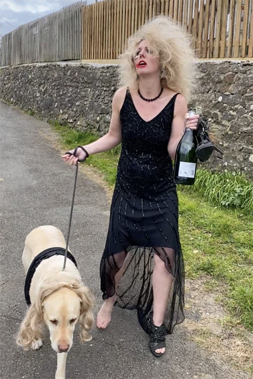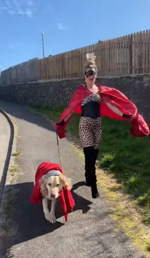 Por eso, en una iniciativa poco usual la mujer se ha propuesto sacar a pasear todos los días a su mascota, un perro labrador llamado Hendrix por las calles de su vecindario, vestida con extravagantes diseños textiles, en un intento por hacer olvidar esta tragedia y arrancar una sonrisa a la gente en estos días de encierro obligatorio.