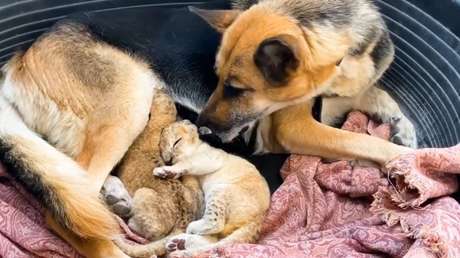 La solución fue dejar a los dos animales salvajes a manos de una perrita. Sandra es una can pastora alemán de ocho años. Es madre de una cría de perro, pero ahora a su cargo ha decidido abrir dos cupos más en su pecho para amamantar y criar a los cachorros de león que han quedado abandonados.