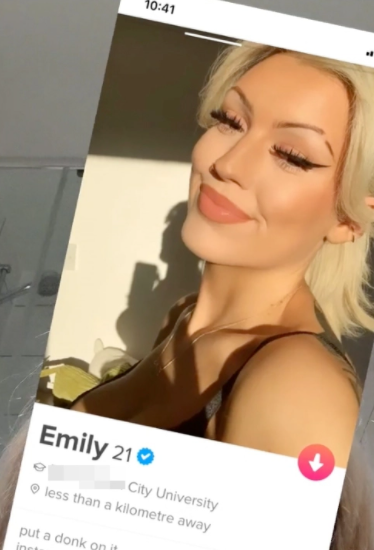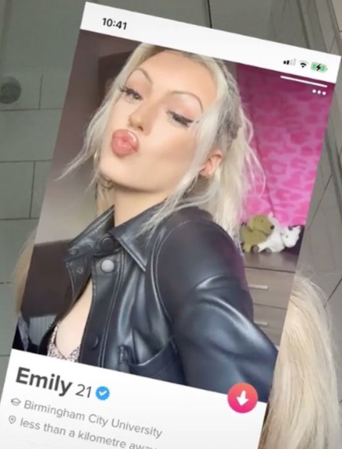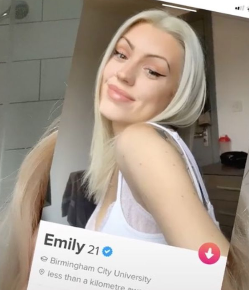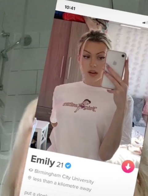 El perfil de citas de Emily la muestra posando solo de un lado, una sensual foto en la cabeza y una selfie en el espejo, donde sin saberlo tenía el brazo derecho detrás de la espalda.