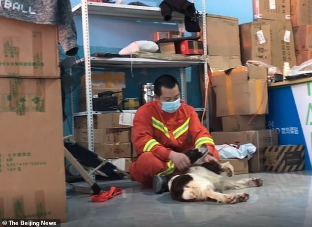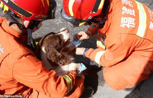 El perro llamado Bei Bei trabajó durante tres días para encontrar personas atrapadas en el hotel colapsado en cuarentena.