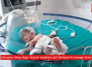 Un par de perros callejeros oyeron llorar a la niña y se acercaron a investigar. Cuando reconocieron que era un bebé humano, los cachorros la sacaron del desagüe.