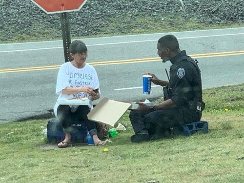 Entonces el oficial Michael fue hasta una pizzeria cercana y compró pizzas de pepperoni y queso para llevar, y se sentó en el césped junto a ella. Este noble oficial estuvo durante una hora conversando con la mujer sin hogar, que según él se identificó como Michelle compartiendo historias de sus vidas.
