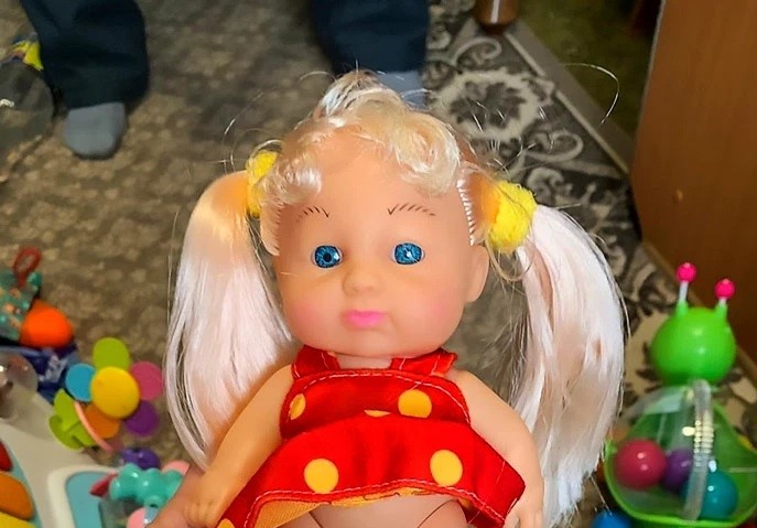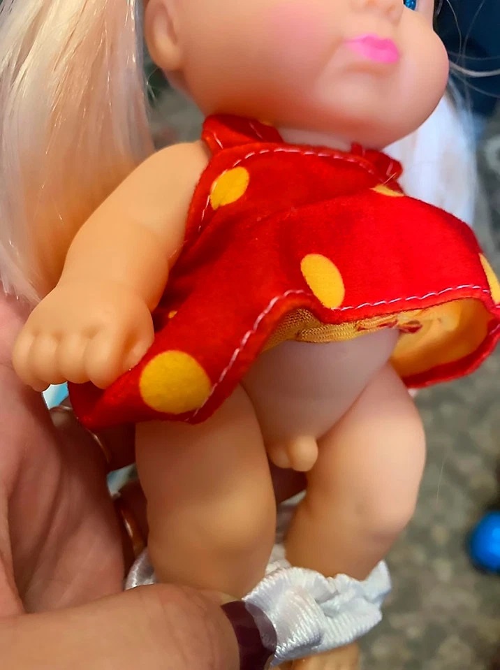 Como se ve en una de las fotos, la muñeca con un vestido de lunares tiene un “pequeño amigo” colgando de su cuerpo.