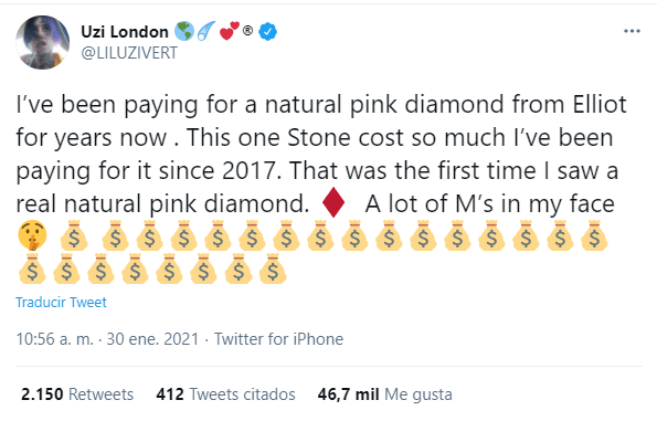 A través de sus redes sociales, Vert ya había dado a conocer que desde hace años estaba pagando un diamante rosa natural… “La piedra cuesta tanto que la he estado pagando desde 2017. Varios millones en mi cara”, escribió en un reciente post de Twitter.