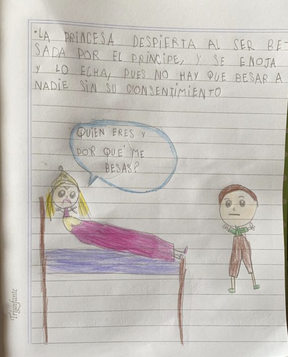 Luego dibujó la última escena, con Aurora despertando por el beso del príncipe, pero en vez de una sonrisa, la niña agregó las líneas: “¿Quién eres y por qué me besas? La princesa despierta al ser besada por el príncipe y se enoja y lo echa, pues no hay que besar a nadie sin su consentimiento”.