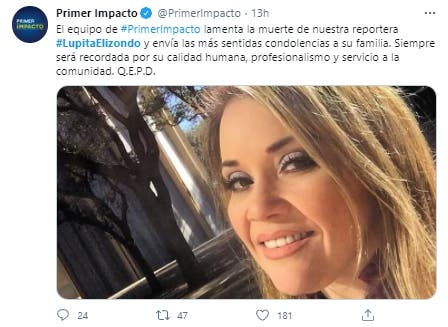 El mundo del periodismo mexicano está de luto ante el fallecimiento de Lupita Elizondo, quien fuera corresponsal de espectáculos de los programas televisivos Primer Impacto y El Gordo y La Flaca.