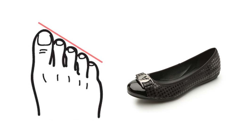 En este tipo de pie, el segundo dedo es más largo que los demás, lo que significa que precisas un calzado con la extensión suficiente para evitar que el pie sufra. Debes elegir un zapato de horma ancha y punta redonda. También te convienen los que tienen punta larga.