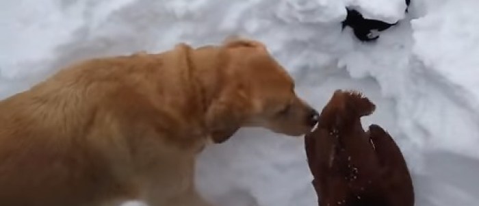 Todo sucedió cuando un perro buscaba algo entre la nieve y rápidamente encuentra algo enterrado.