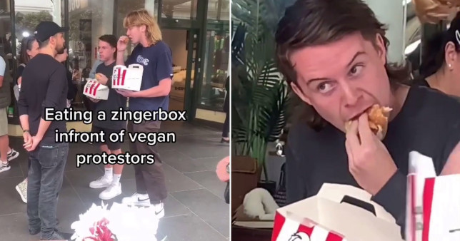 ‘Tiktokers’ comen pollo frito delante de manifestantes veganos