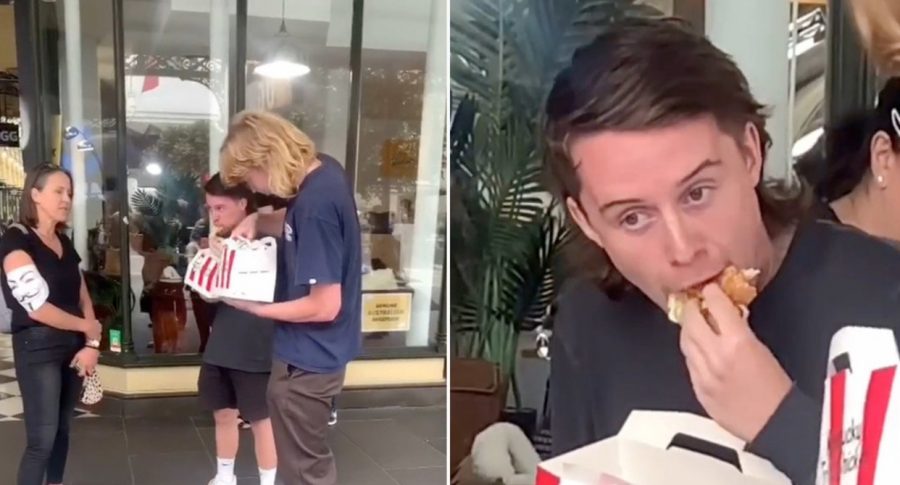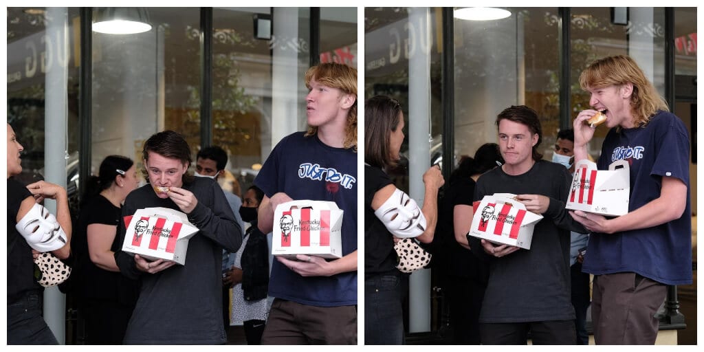 Dos ‘tiktokers’ publicaron el 6 de febrero un video donde comían pollo frito delante de un grupo de manifestantes veganos en Melbourne (Australia) pic.twitter.com/DlpC7JUUtL