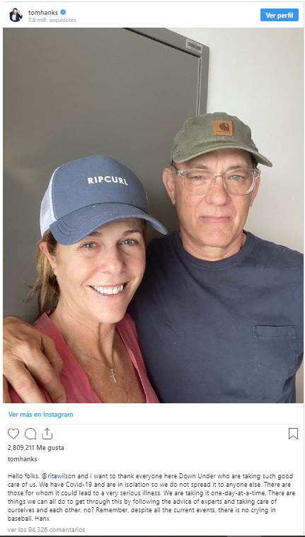 “Hola amigos. Rita Wilson y yo queremos agradecer a todos los que están aquí en Australia que nos cuidan tan bien. Tenemos Covid-19 y estamos aislados, así que no se lo contagiamos a nadie más”, dijo.