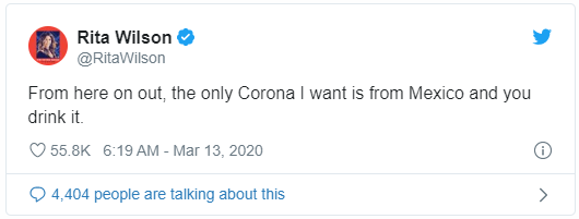 Wilson también publicó un tweet alegre escribiendo: “De aquí en adelante, el único Corona que quiero es de México y lo bebes”.