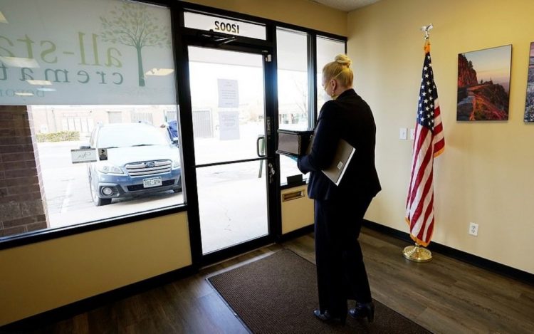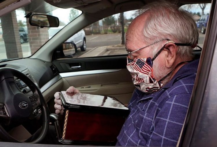 En cuanto llegó a una sucursal de All-States Crematorium en Colorado, recibió indicaciones de que debía retirar las cenizas de su esposa por medio de una ventana en el estacionamiento. Se trata del nuevo procedimiento que la empresa lleva a cabo para poder cumplir con la normativa del distanciamiento social. Luego de firmar unos papeles, Jim toma la pequeña caja de madera con lágrimas en los ojos.