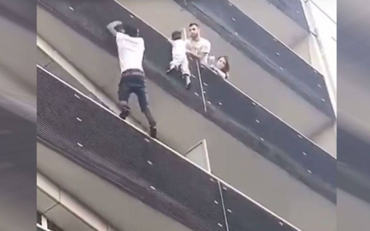 El video del impactante momento está circulando por todas las redes sociales, y se puede ver a un hombre de 30 años escalando cuatro pisos para salvar a un niño que se encontraba agarrado al balcón.