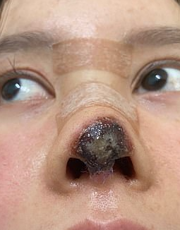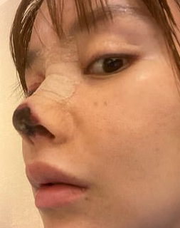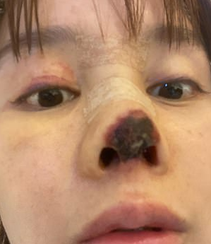 Las fotos que publicó de su rostro muestran un parche claro de carne ennegrecida en la punta de la nariz, así como vendajes y hematomas.