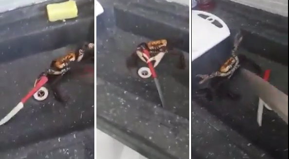 Ambos tenían cuchillos para defenderse y lo más impresionante fue la habilidad del cangrejo para mover el arma y caminar sobre la pileta de la cocina.
