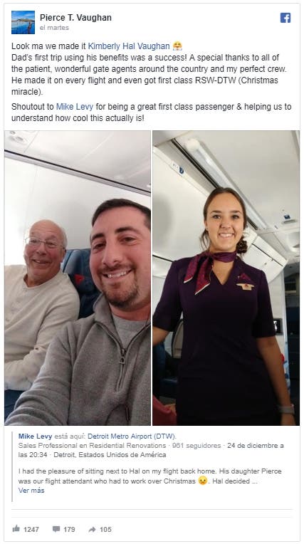 Al día siguiente, Pierce Vaughan compartió la publicación de Mike Levy en su propia cuenta de Facebook: “Mira ma, lo hicimos. ¡El primer viaje de papá usando sus beneficios fue un éxito! Un agradecimiento especial a todos los pacientes, maravillosos agentes de la puerta en todo el país y a mi equipo perfecto”.